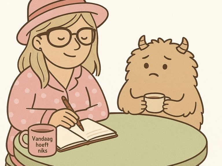 Een paar minuten later zit ze aan haar groene ronde tafel en schrijft die twijfeltjes in haar dagboek om ze eens even flink te relativeren.